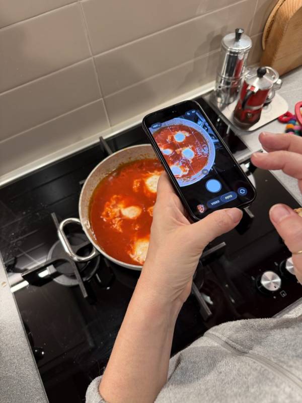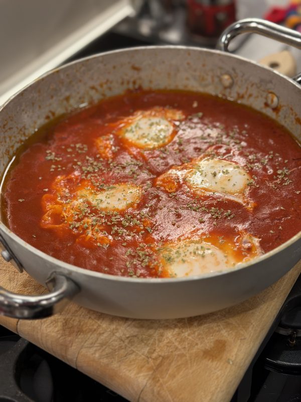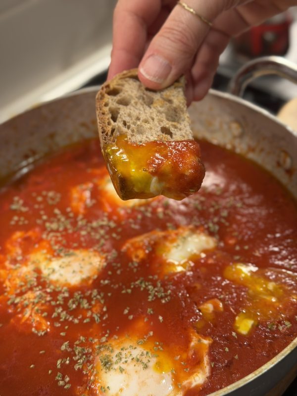 Al di là dell’immagine evocativa, il risultato è una preparazione straordinariamente confortante: la salsa di pomodoro profumata, le uova appena rapprese e il tuorlo ancora morbido da raccogliere con un buon pezzo di pane.